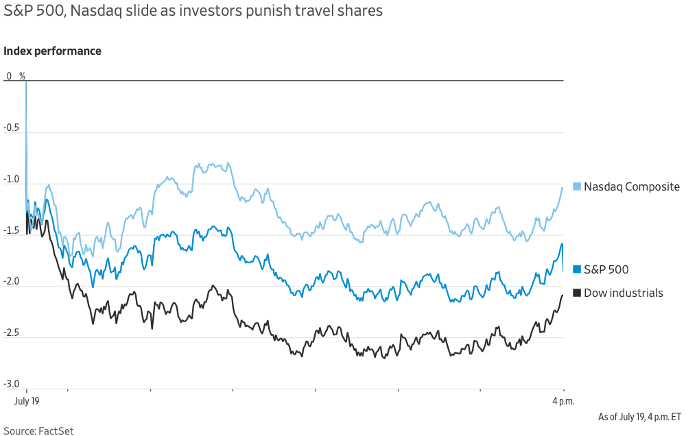 US stocks fell aggressively Monday on concern a rebound in Covid-19 cases would slow global economic growth. The selling picked up as the session continued and the Dow Jones Industrial average was currently headed for its biggest drop of the year.